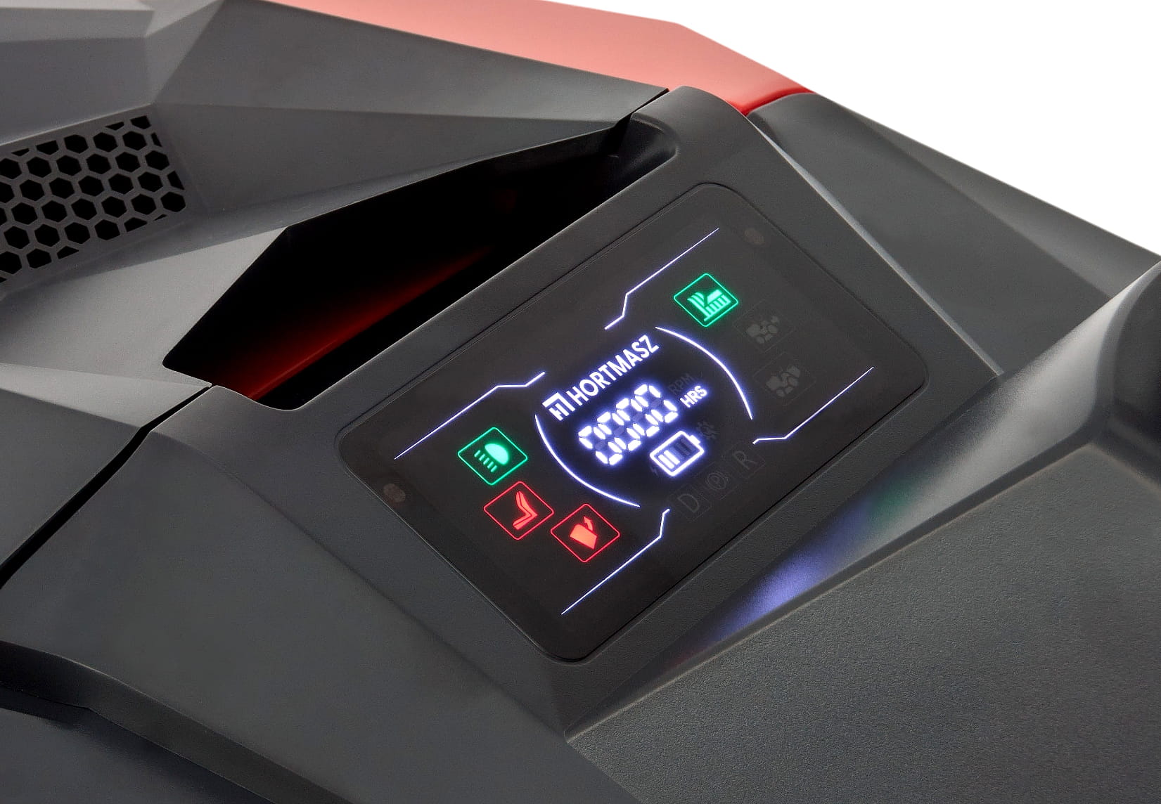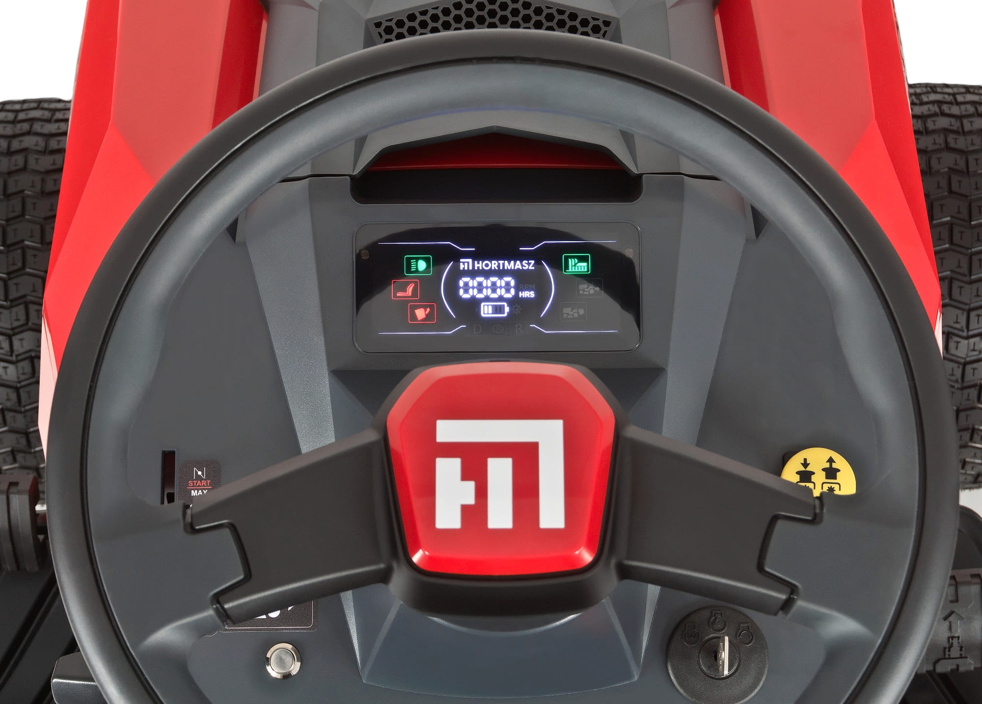 Traktorek wyposażono w nowoczesny, wielofunkcyjny kolorowy wyświetlacz, który dostarcza kluczowych informacji w czasie rzeczywistym. Dzięki intuicyjnemu interfejsowi operator ma pełną kontrolę nad maszyną bez potrzeby odrywania wzroku od pracy.